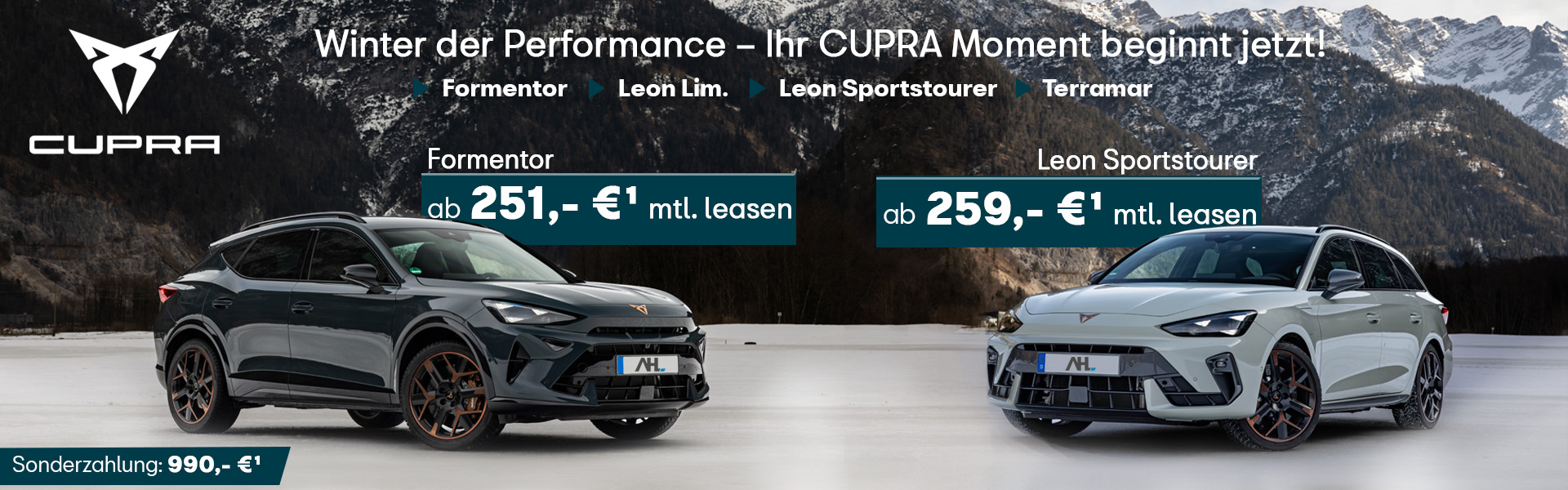 Sichern Sie sich jetzt Ihren CUPRA mit attraktiven Leasingkonditionen: Der Terramar ab nur 333,- €¹/Monat, der Formentor und die Leon Limousine bereits ab 251,- €¹/Monat sowie der Leon Sportstourer ab 259,- €¹/Monat – jeweils mit einer einmaligen Sonderzahlung von nur 990,- €¹. Profitieren Sie von diesem exklusiven Angebot und starten Sie sicher und stilvoll durch den Winter. Nur gültig bis 31.12.2025 – jetzt bestellen und Ihr CUPRA-Erlebnis sichern!