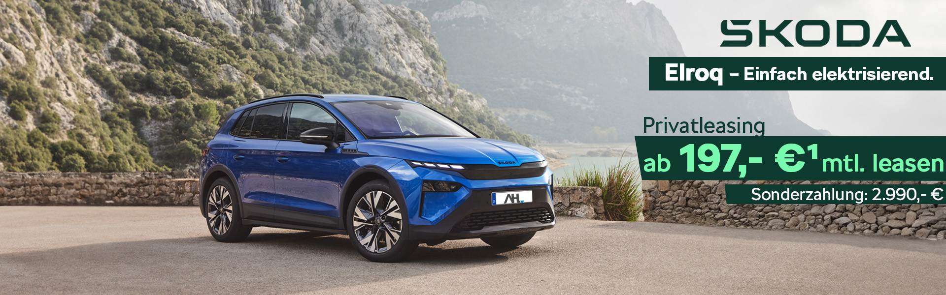 Entdecken Sie jetzt den neuen Škoda Elroq – ein vollelektrisches Kompakt-SUV, das sowohl für moderne Familien als auch für Pendler ideal ist und gleichzeitig all jene anspricht, die umweltbewusst und stilvoll unterwegs sein möchten. Mit unserer attraktiven Privat-Leasingaktion können Sie sich den Škoda Elroq bereits ab 197,- €¹ monatlich sichern, bei einer Sonderzahlung von lediglich 2.990,- €.