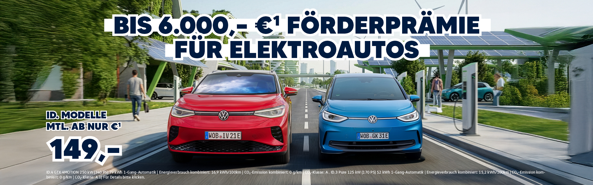 Fazit: Jetzt ist der perfekte Zeitpunkt, um auf ein ID.-Modell umzusteigen. Mit monatlichen Raten ab 149,- €¹ und Förderungen bis zu 6.000,- € können Sie emissionsfrei, günstig und zukunftssicher fahren. Informieren Sie sich noch heute bei Ihrem Volkswagen-Händler und sichern Sie sich Ihr Traumfahrzeug.