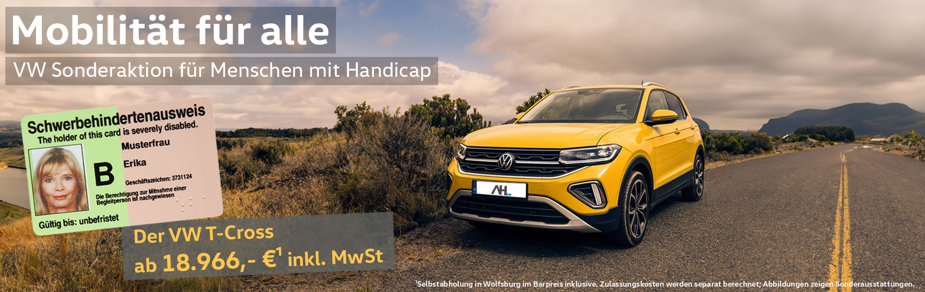 Bei der Automobilgruppe Harz-Leine legen wir großen Wert darauf, dass sich jeder Kunde bei uns rundum wohlfühlt. Deshalb möchten wir mit unserer aktuellen VW Sonderaktion speziell für Menschen mit Handicap ein besonderes Angebot schaffen. So bieten wir Ihnen nicht nur attraktive Barpreise, sondern auch die Möglichkeit, das Modell T-Cross zu besonders günstigen Konditionen zu erwerben.